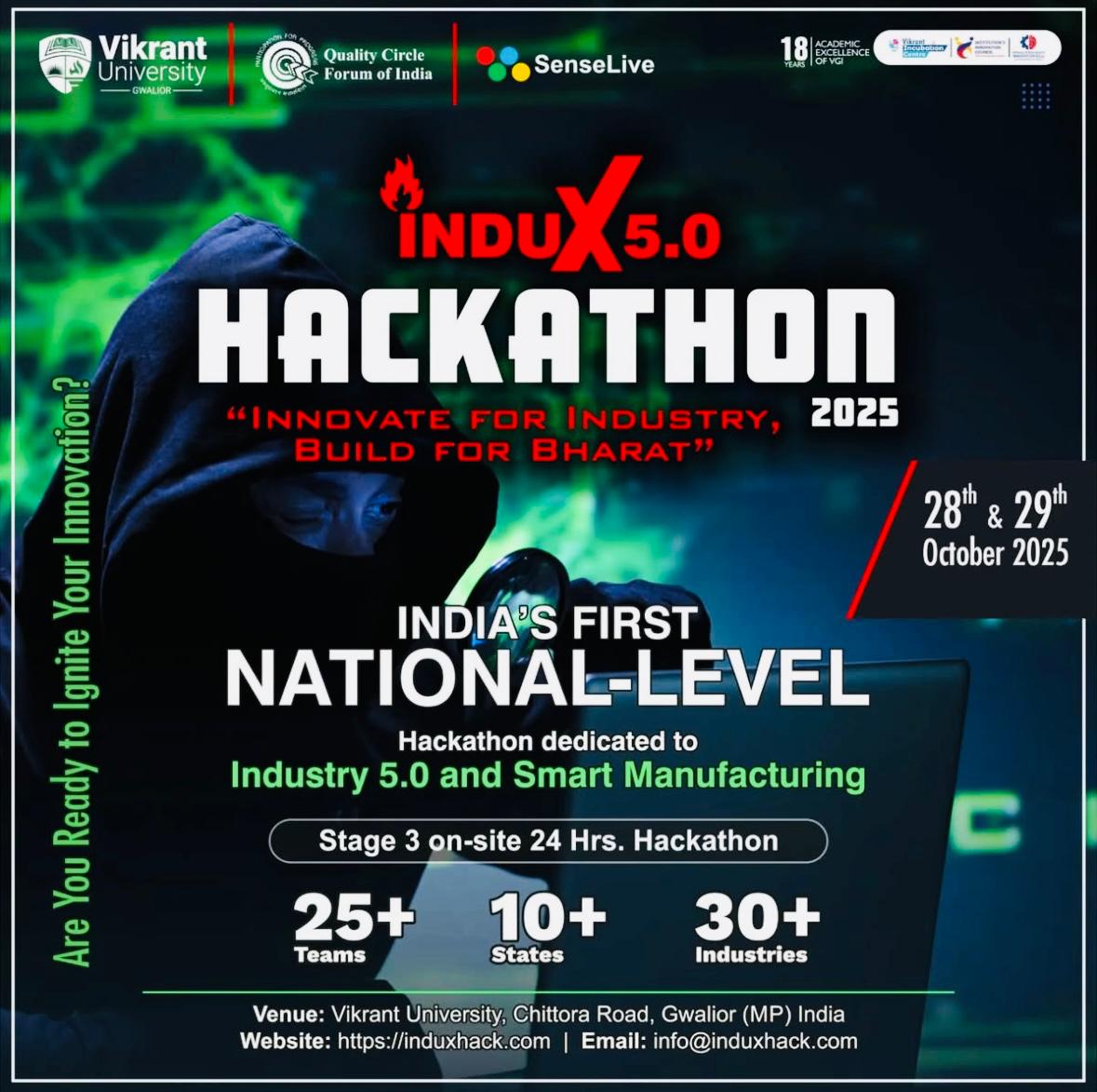 We are pleased to announce INDUX 5.0, India’s first National-level Hackathon on Industry 5.0 and Smart Manufacturing, spearheaded by the Vikrant University, Quality Circle Forum of India (QCFI) and SenseLive.