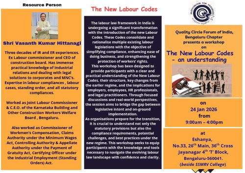 QCFI Bengaluru Chapter is organizing Workshop on “THE NEW LABOUR CODES – AN UNDERSTANDING” on 24th Jan,2026